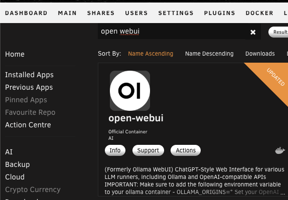 The next container is Open WebUI. This gives us a web interface for managing AI models on Ollama and chatting with them. Search for Open WebUI in the Apps tab and install it.